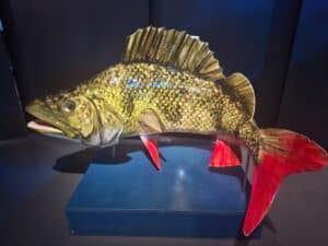 Efter en sandwich foran det store akvarie kunne rundvisningen begynde. En særdeles informerende guide, fortalte livligt om Aqua, tingene vi så, og ikke mindst de ting vi ikke kunne se. For det helt store akvarie, der er inddelt i flere miljøer, forsøger man at holde så naturligt som muligt, og det betød at mørket var faldet på i søen, mosen og åen. Det var dog stadig muligt at få et glimt af nogle Gedder og Aborre der fik de fleste til at drømme om en dag med fiskeri i omgivelserne.